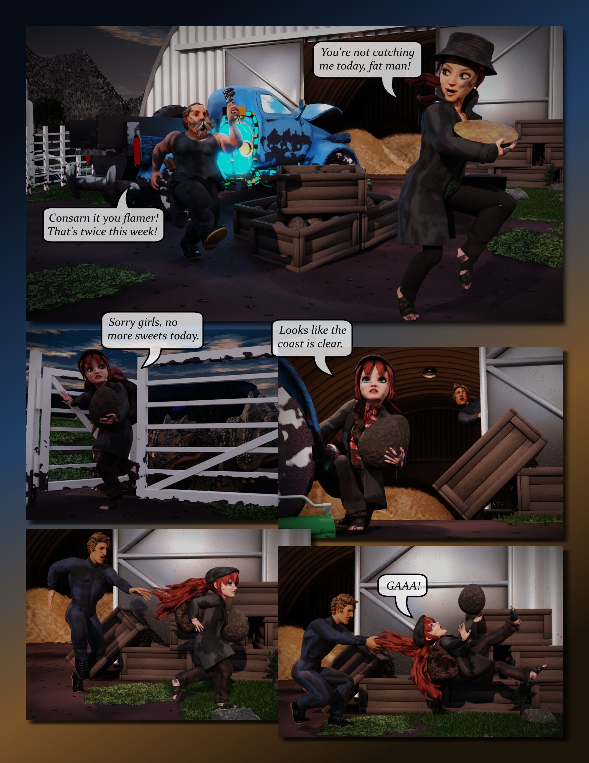 With her sprinting off like a one-woman whirlwind and the farmer in hot pursuit, Zannie slips toward the exit unnoticed — or so she thought…